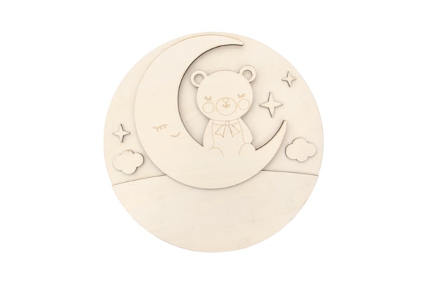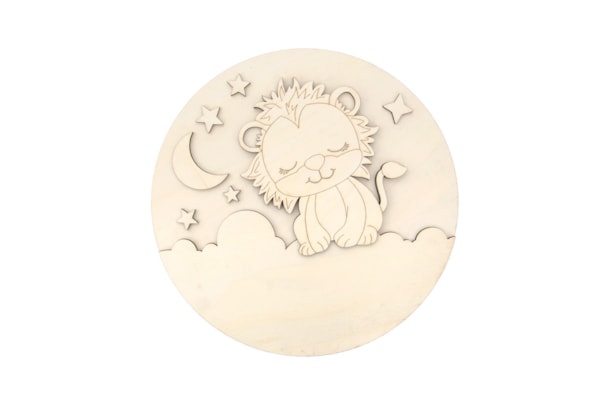Peça em madeira de choupo natural (4mm de espessura) com 30cm de diâmetro. Disponível em vários modelos de desenhos infantis, todos com a possibilidade de serem personalizados com o nome da criança (Ref. 742556) – tornando cada peça única e especial.