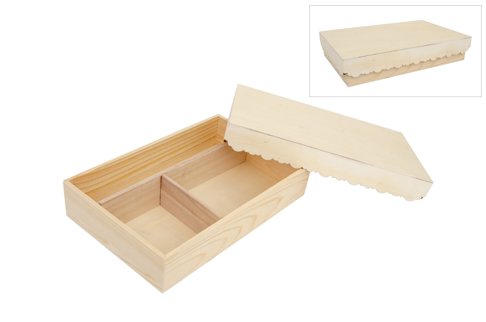 Caixa de madeira com 3 divisões para acessórios de batizado, vela, toalha e concha. A tampa é de encaixe e tem recortes o que a torna elegante e diferente.