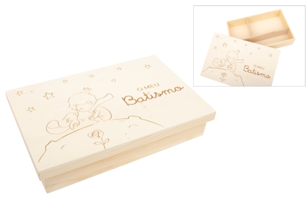 Esta elegante caixa de madeira é perfeita para guardar os itens do batismo, como a vela, toalha e concha. Com divisões internas para organizar tudo de forma prática e cuidadosa, a caixa é gravada a laser com a inscrição "O Meu Batismo" na tampa.Para complementar a decoração, a caixa apresenta também o encantador tema do Principezinho, com o personagem sentado em cima da lua acompanhado pela raposa e a sua rosa, tornando-a uma peça única e cheia de significado para este momento especial.Uma lembrança adorável e personalizada, perfeita para guardar os objetos preciosos do batismo.