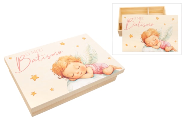 Caixa de madeira lacada, com divisórias interiores para guardar a vela, a toalha e a concha. A tampa apresenta uma doce ilustração de um anjinho a dormir, complementada pela frase "O meu Batismo" em impressão UV de alta qualidade. Uma peça prática e decorativa, perfeita para marcar este momento único.