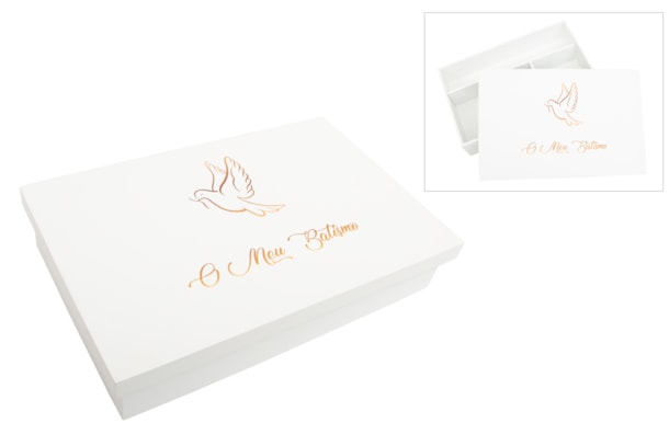 Caixa de madeira lacada, com divisórias interiores para guardar a vela, a toalha e a concha. A tampa é decorada com uma delicada ilustração de uma pomba, aplicada através de impressão UV, garantindo cores vivas, detalhes nítidos e alta durabilidade. Inclui a frase "O meu Batismo", também impressa em UV. Uma peça prática e decorativa, perfeita para marcar este momento único. Disponível em diversas cores.