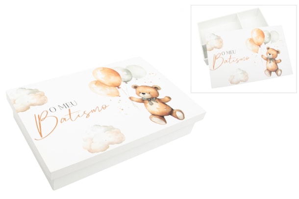 Caixa de madeira lacada, com divisórias interiores para guardar a vela, a toalha e a concha. A tampa é decorada com uma delicada ilustração de um urso com balões, aplicada através de impressão UV, garantindo cores vivas, detalhes nítidos e alta durabilidade. Inclui a frase "O meu Batismo", também impressa em UV. Uma peça prática e decorativa, perfeita para marcar este momento único.