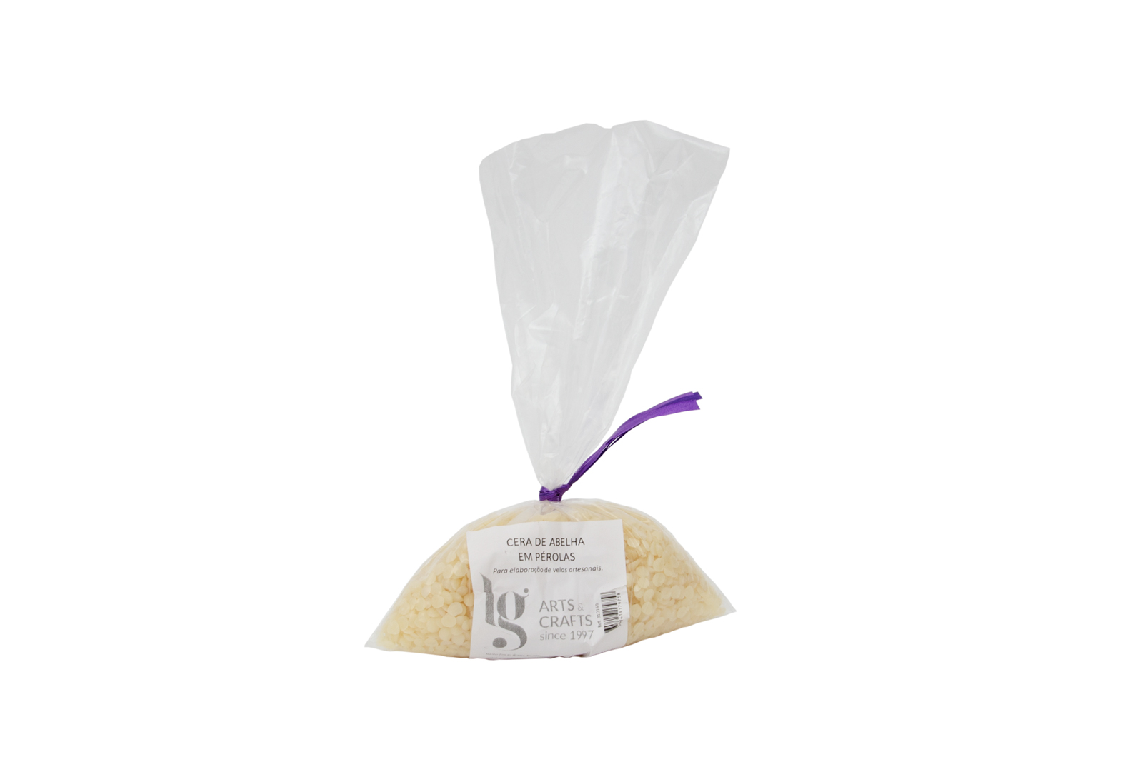 Cera abelha. Natural, a cera de abelha tem o cheiro do mel e pode ser usada para fazer cosméticos e velas. A cera de abelha é emoliente, calmante e tem propriedades amaciadoras e hidratantes para a pele. A apresentaçao em "pérolas" ajuda a dosear melhor a sua utilizaçao.