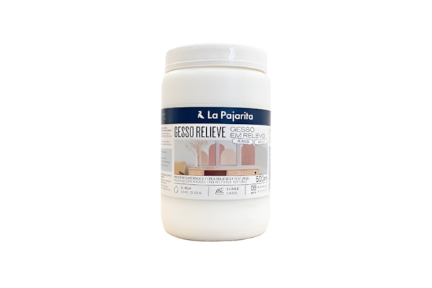 Gesso relevo a base de agua. Multisuperficie : madeira, plastico, metal, etc. Permite preparar qualquer superficie acrescentando lhe volume e espessura: ideal para criar relevos e texturas em obras de arte, moveis ou paredes. Pode ser misturado com tintas a base de agua para modificar a cor do seu acabamento. . Elevada cobertura e aderencia. Lavável com agua e sabão. Não amarelece.