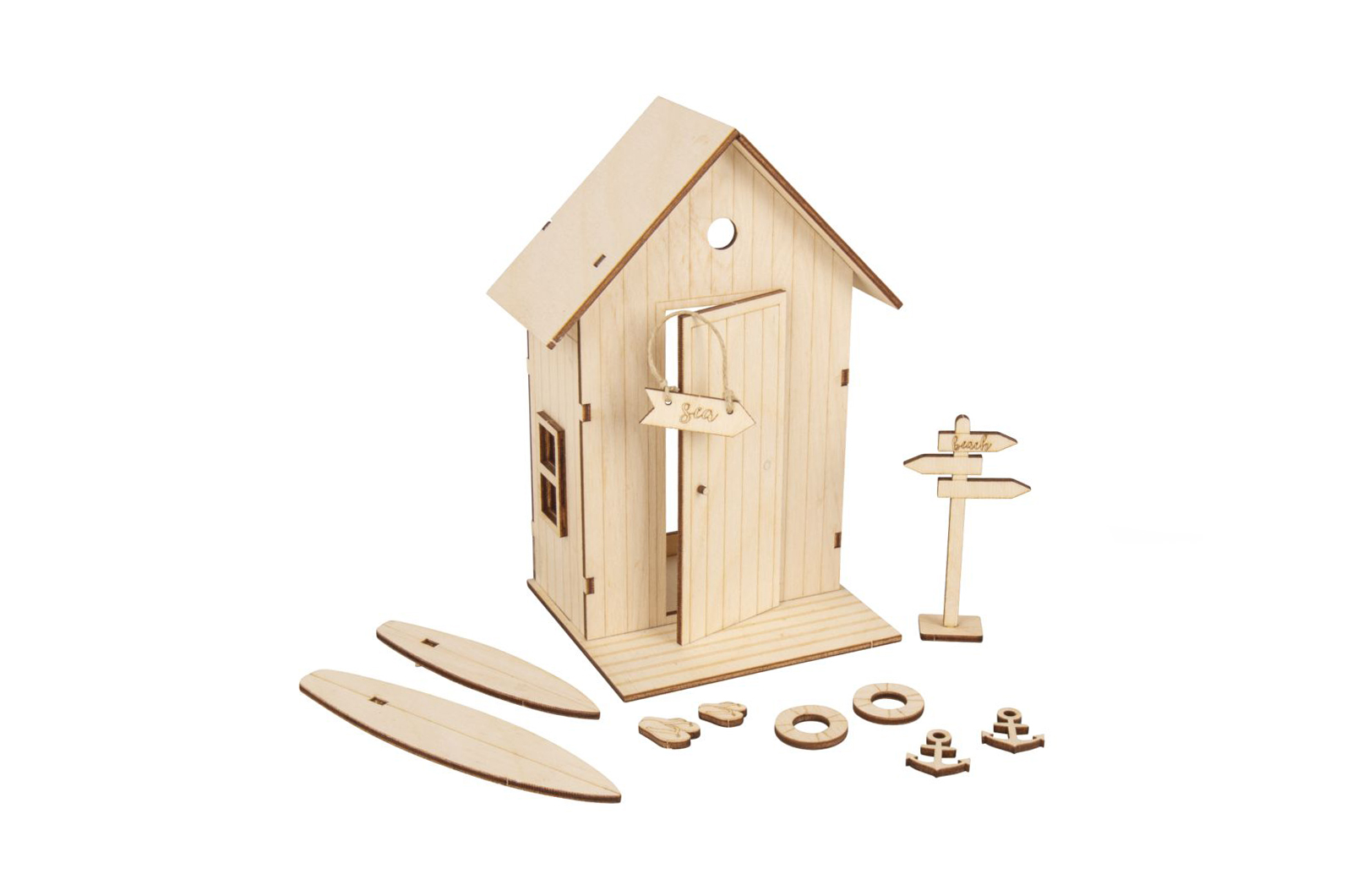 Kit de construção em madeira Cabana de Praia, 10,5 x 9.6 x 17.3 cm, 24peças + cordão de juta para pendurar.