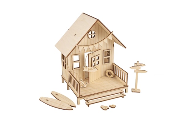 O kit de construção em madeira Casa de Praia pode ser personalizado, iluminado ou complementado com outros acessórios do mundo em miniatura.