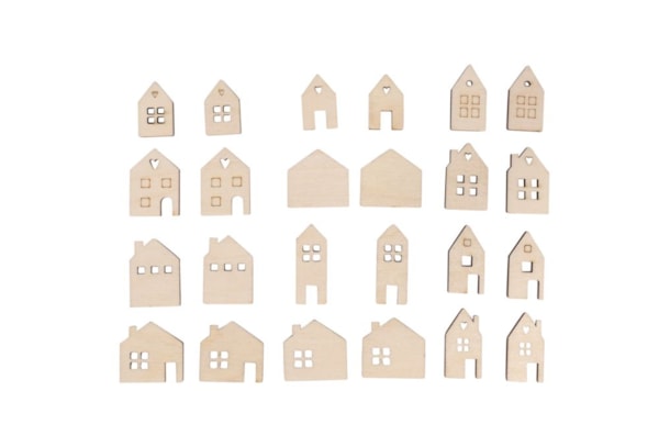 Conteúdo: 24 mini casas de madeira, espessura aprox. 2 mm, tamanhos diferentes, aprox. 2,5 - 3,5 cm. Fabricado com madeira certificada pelo FSC proveniente de silvicultura responsável.