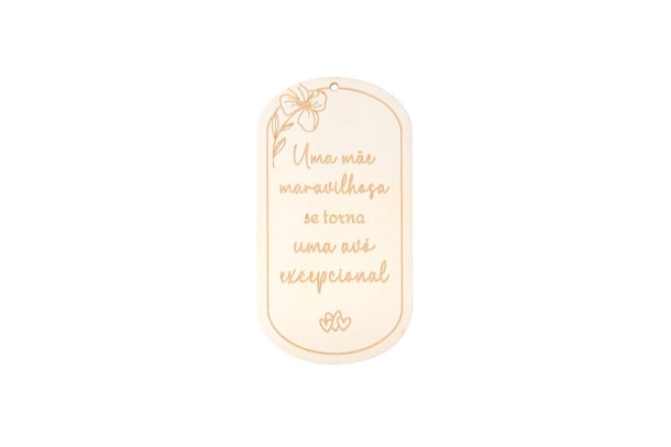 Celebre a doçura de quem é mãe e avó com esta placa delicada em madeira de choupo. Apresenta a gravação de uma flor e a frase: "Uma mãe maravilhosa se torna uma avó excepcional."Com um acabamento natural e furo superior para pendurar, é o detalhe perfeito para personalizar presentes ou decorar um cantinho especial com todo o afeto. Dimensões 6.3X12X0.3cm.