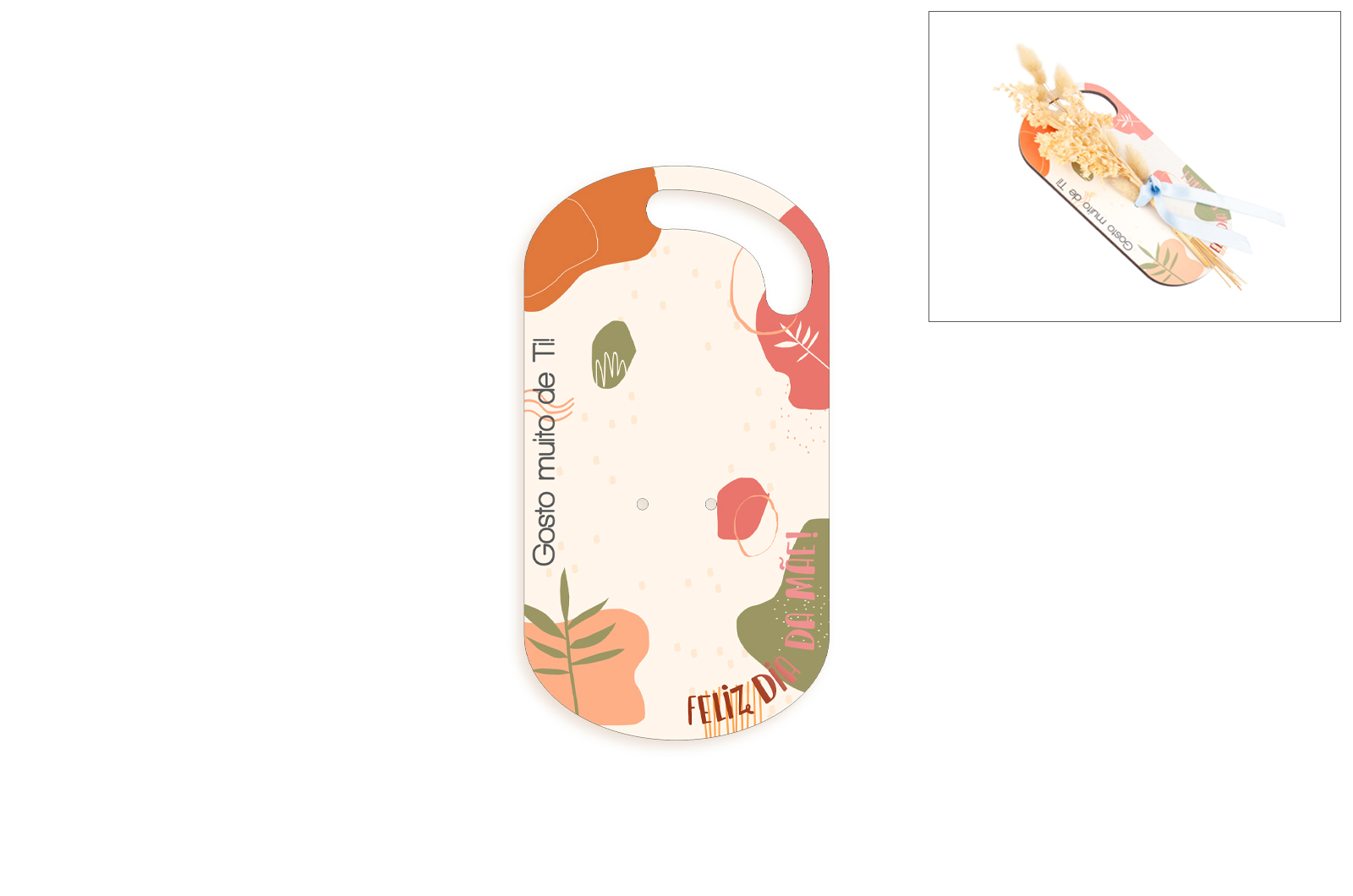 Elegância e personalização unem-se nesta placa 'Feliz Dia da Mãe'. Apresenta uma estética Boho moderna em tons quentes e orgânicos. O design inovador inclui uma pega ergonómica e orifícios para a aplicação de flores frescas ou secas e fitas decorativas, permitindo que cada oferta seja única. O detalhe diferenciador que permite oferecer arte e natureza num só objeto.
