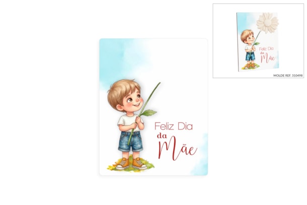 Dê asas à sua criatividade com esta delicada placa em MDF branco. A ilustração, impressa em UV de alta definição, apresenta um menino que segura o talo de uma flor, acompanhada pela inscrição carinhosa "Feliz Dia da Mãe". Esta peça foi desenhada para ser o suporte perfeito para aplicações em gesso, convidando-o a completar o design com um elemento em relevo.