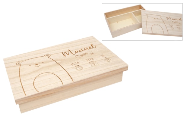 Wooden box with compartments to store birth mementos, such as the first pacifier, hospital bracelet, first booties, or even the first photographs. The lid is laser-engraved with the name and birth details, and the decoration is complemented with a cuddly teddy bear.