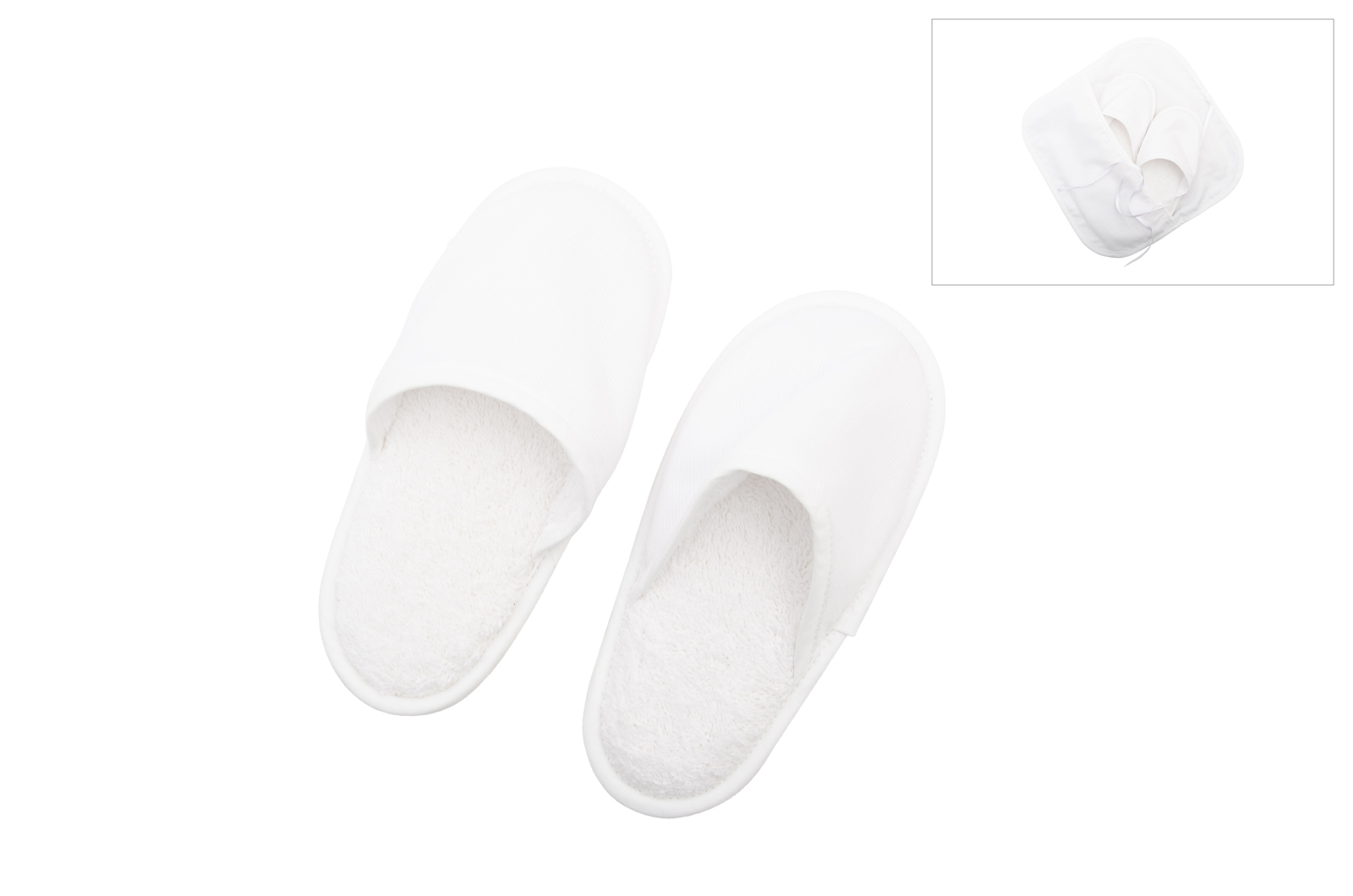 Pair of children's slippers with bag, 100% cotton. White fustian fabric. They have a soft sole and an upper that can be decorated or painted, allowing you to personalize them to your liking. They also come with a practical bag, ideal for storing or transporting the slippers easily.