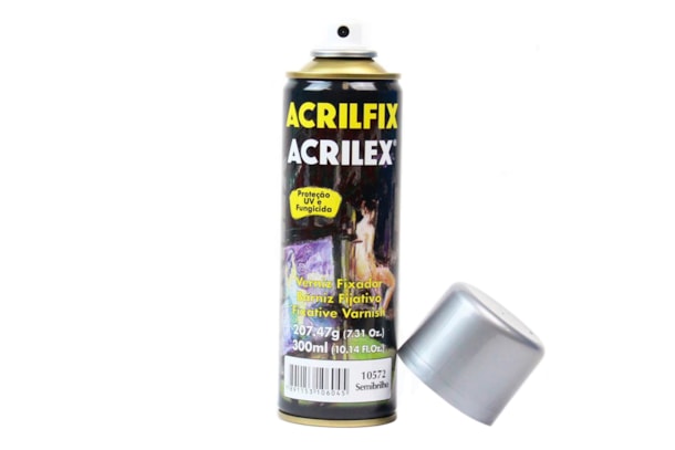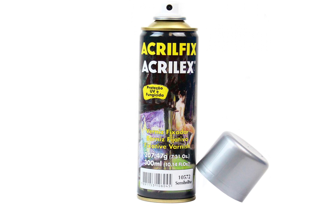 VERNIZ SPRAY ACRILFIX 300ML SATINADO 10672 ACRILEX. For finishing and protection of oil or acrylic paintings on canvas, pastel, charcoal, and craft works. has UV absorbers and fungicide.