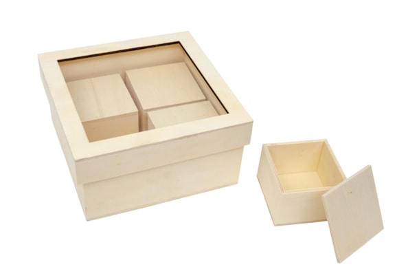 Caja de madera con cuatro cajas en el interior para guardar los recuerdos del bebé.