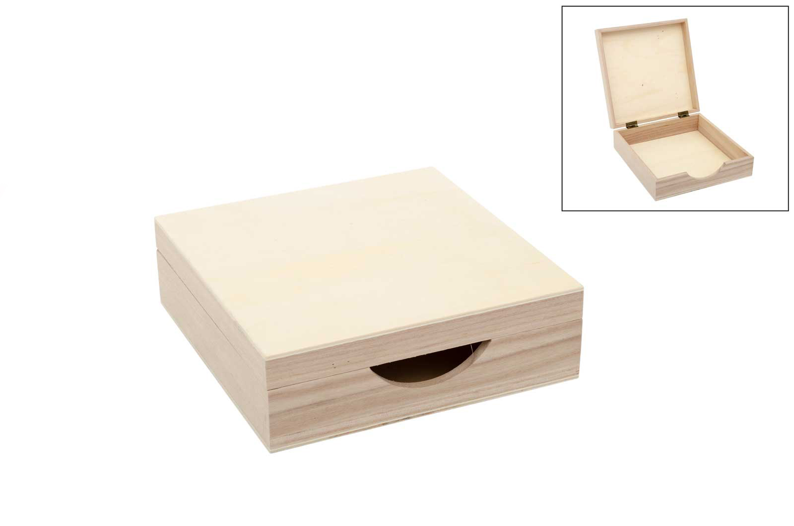 Caja de madera para guardar servilletas. Medidas: 20x20x6.5cm.