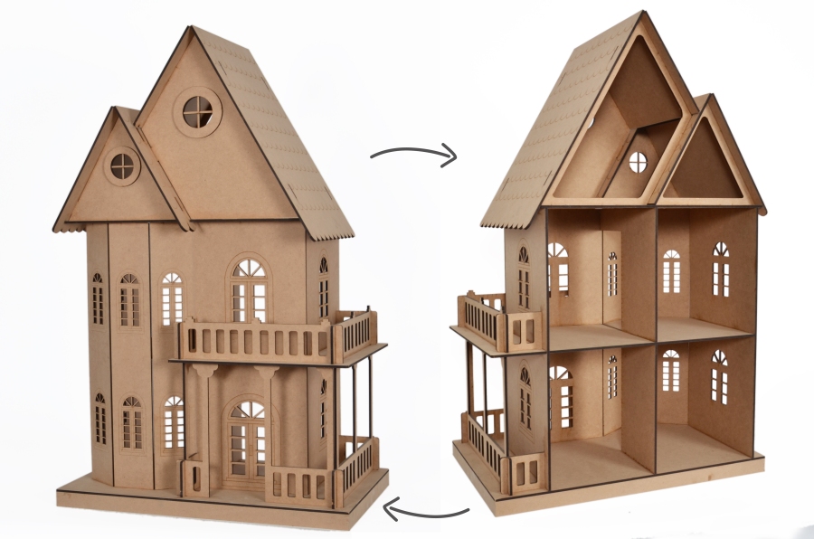 Casa de muñecas cortadas con láser para decorar. Se envía desmontada en caja con instrucciones de montaje. Hecho en Portugal.