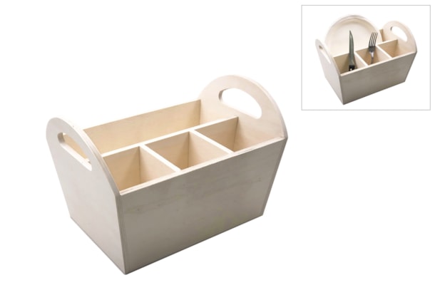 Cesta de madera con divisiones. Se puede colocar cubiertos y platos. Medidas: 29x19.5X19CM