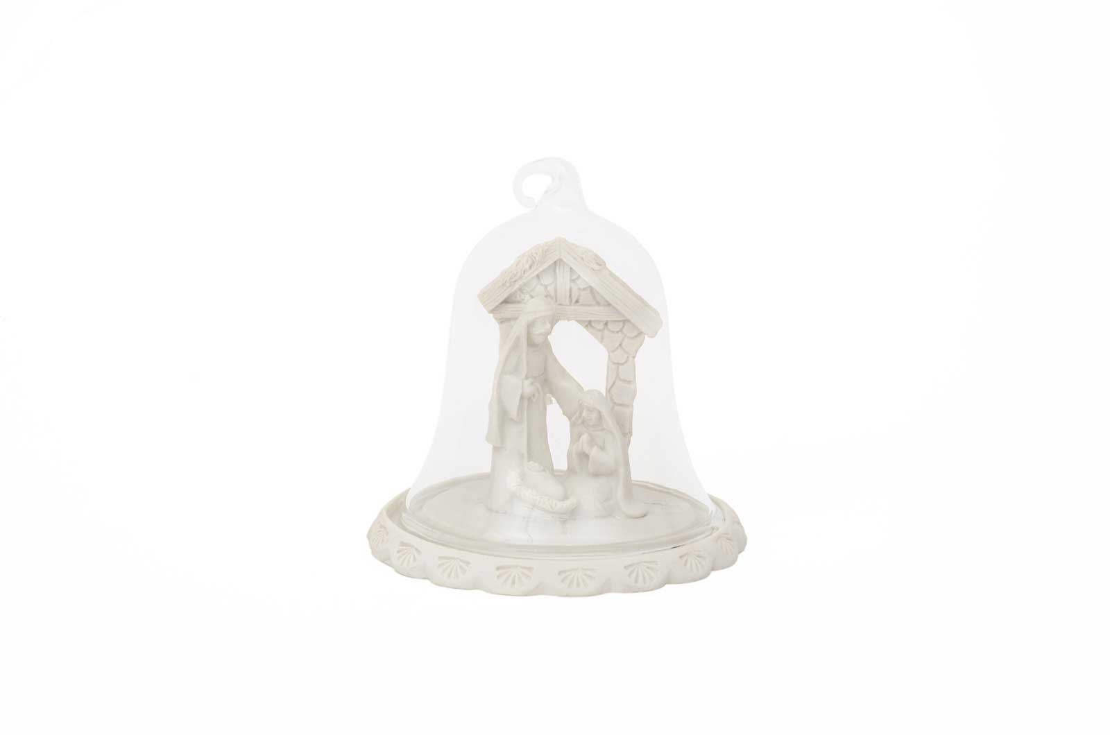Belén con campana. Pieza decorativa de marfilina, de 9 cm de altura, que destaca por sus delicados detalles y su acabado cuidadoso, siendo ideal para decorar espacios con un toque de tradición y elegancia.