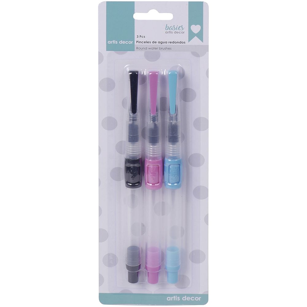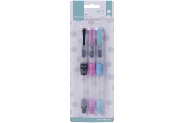kit de pinceles redondos, con deposito de agua, de tres tamaños. Fino - medio - grueso. Pincel fabricado en nylon con deposito rellenable. Apriete suavemente el barril para llevar agua a la punta. Adequado para extender, suavizar y difuminar colores con agua, acuarelas, lapices acuarelables, lettering, ilustracion, urban sketching, manga y mucho mas. Incluye tapa protectora de la punta . Punta fina.