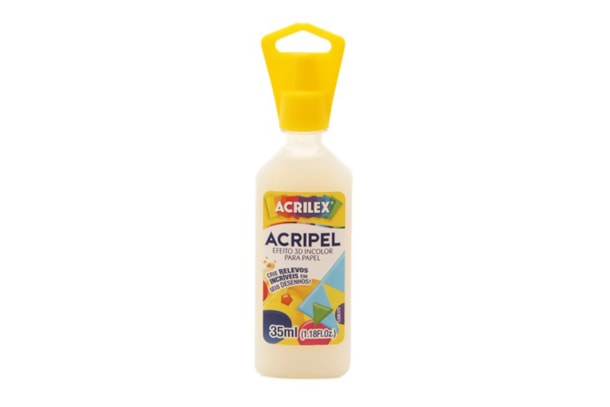 ACRIPEL VERNIZ DIMENSIONAL 35ML ACRILEX. Efeito 3D incolor para papel, para obter relevo 3D com acabamento incolor sobre desenhos pintados com lapis de cor, cera, pinturas manuais, aguarela. tambem pode ser usado para artesanato , em peças pintadas com tintas acrilicas ou Pva (artesanato) . Pode se aplicado sobre papel, cartonagem, goma eva, madeira, mdf, gesso, vidro e tecido (no tecido, nao se poderá lavar) . Em outras superficies, fazer primeira uma amostra.