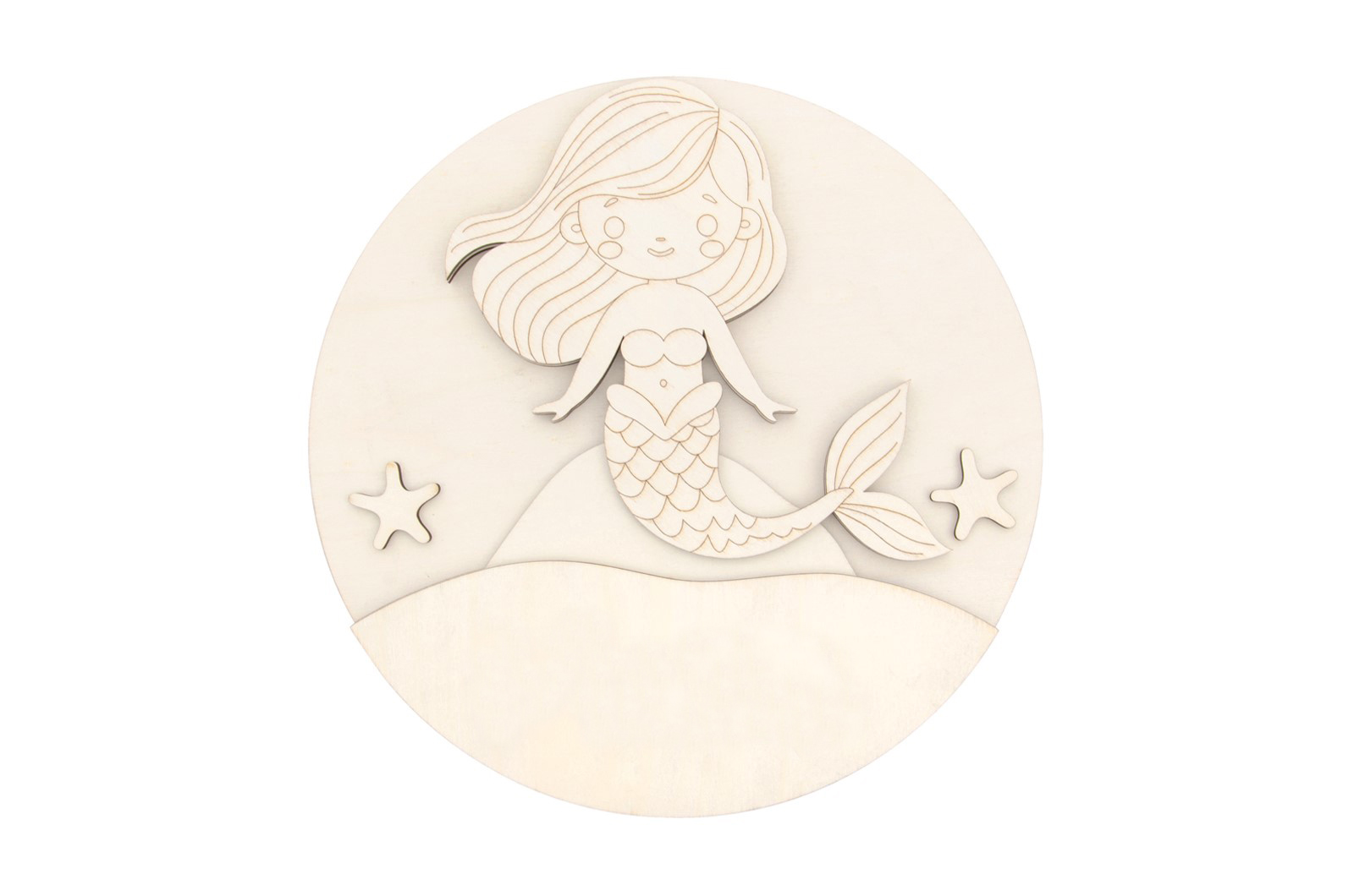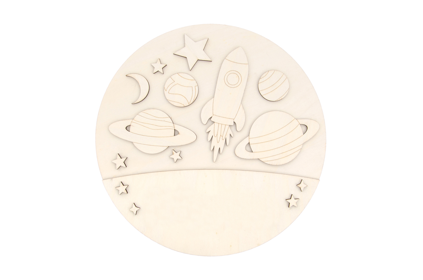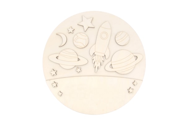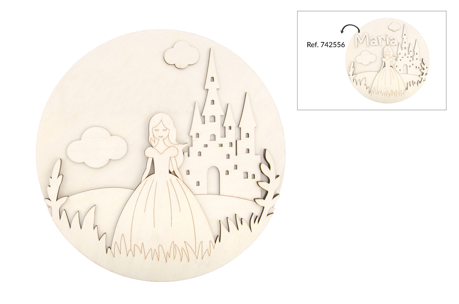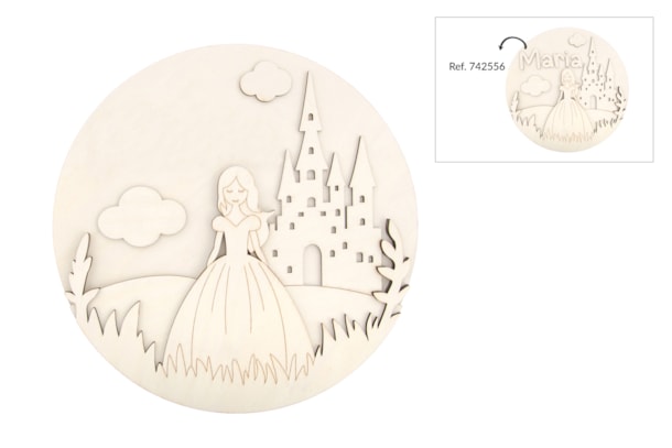 Peça em madeira de choupo natural (4mm de espessura) com 30cm de diâmetro. Disponível em vários modelos de desenhos infantis, todos com a possibilidade de serem personalizados com o nome da criança (Ref. 742556) – tornando cada peça única e especial.
