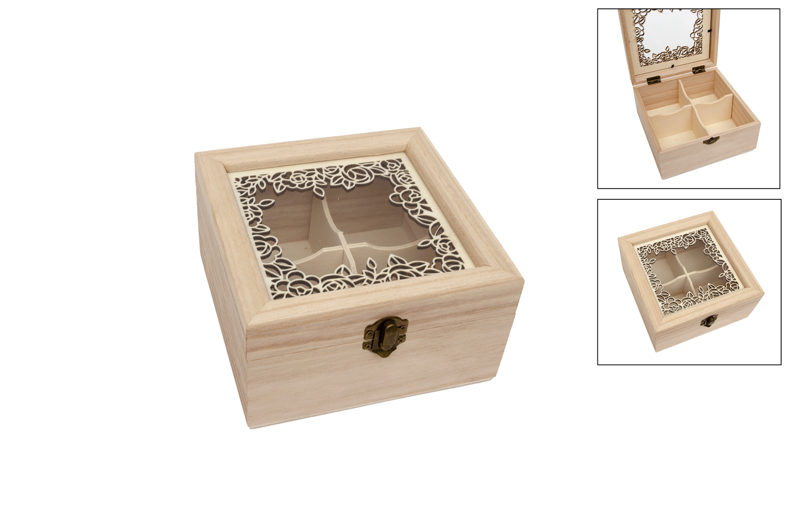 CAIXA CHÁ 4DIV. RENDILHADA 16.5X16.5X9CM C/VIDRO