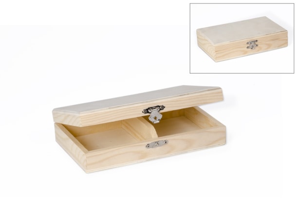 Caixa com divisória que pode ser utilizada para colocar dois baralhos de cartas ou como porta alianças de casamento.
