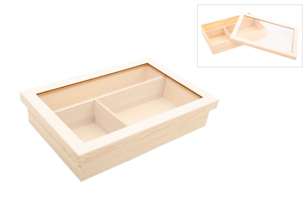 Caixa de madeira com divisões amovíveis. A tampa em acrílico é de encaixe. Pode ser utilizada para guardar as recordações do batizado.