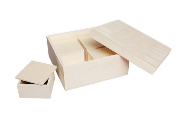 Caixa de madeira com quatro caixinhas dentro para guardar as recordações de bebe.