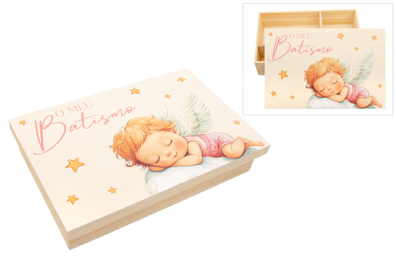 Caixa de madeira lacada, com divisórias interiores para guardar a vela, a toalha e a concha. A tampa apresenta uma doce ilustração de um anjinho a dormir, complementada pela frase "O meu Batismo" em impressão UV de alta qualidade. Uma peça prática e decorativa, perfeita para marcar este momento único.