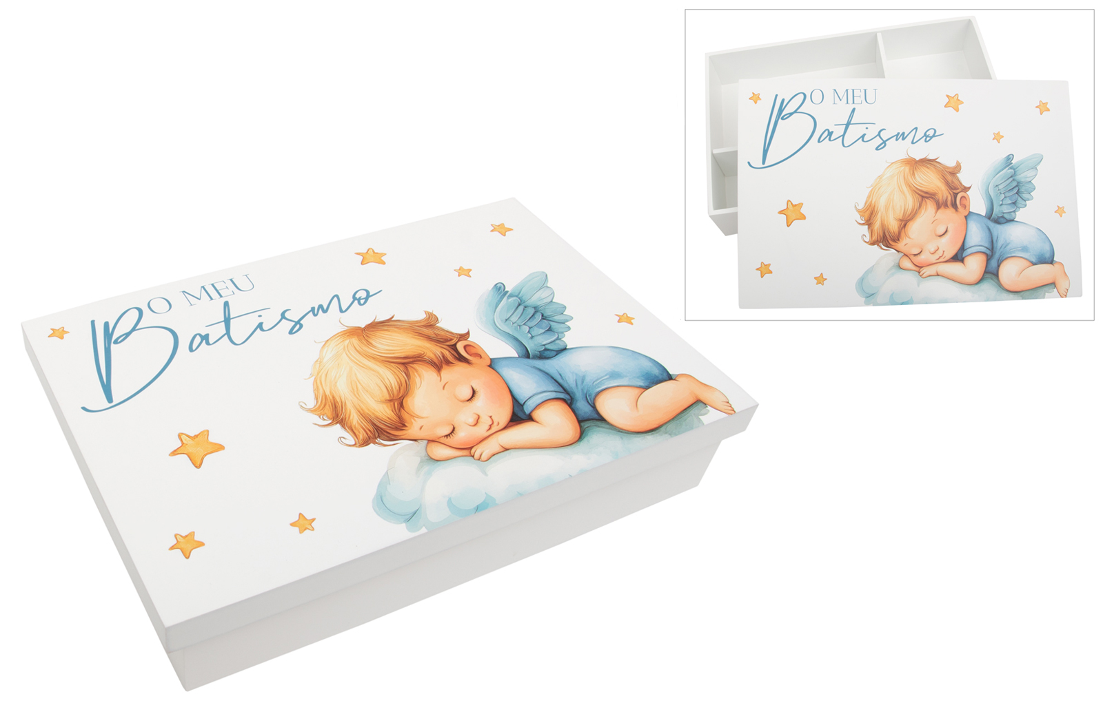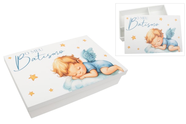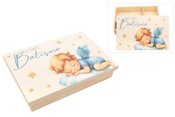 Caixa de madeira lacada, com divisórias interiores para guardar a vela, a toalha e a concha. A tampa apresenta uma doce ilustração de um anjinho a dormir, complementada pela frase "O meu Batismo" em impressão UV de alta qualidade. Uma peça prática e decorativa, perfeita para marcar este momento único.