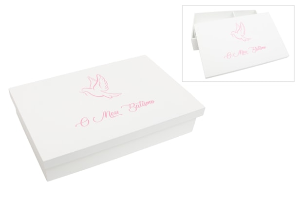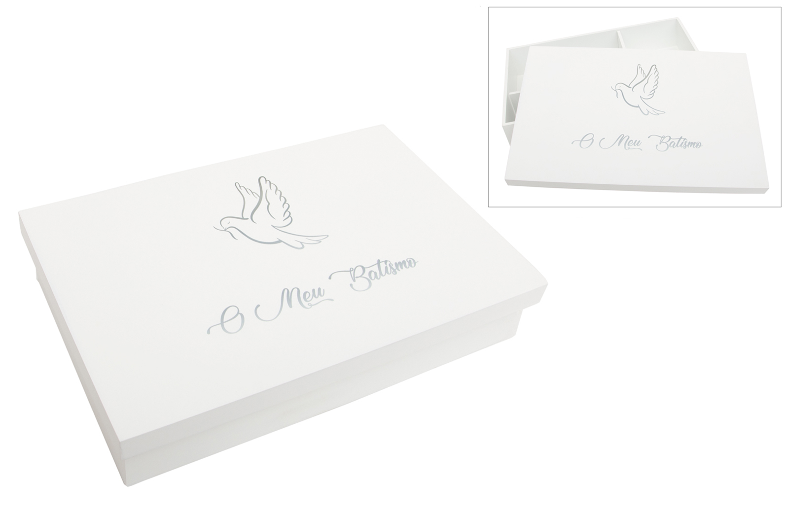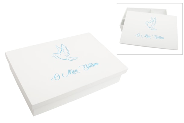Caixa de madeira lacada, com divisórias interiores para guardar a vela, a toalha e a concha. A tampa é decorada com uma delicada ilustração de uma pomba, aplicada através de impressão UV, garantindo cores vivas, detalhes nítidos e alta durabilidade. Inclui a frase "O meu Batismo", também impressa em UV. Uma peça prática e decorativa, perfeita para marcar este momento único. Disponível em diversas cores.