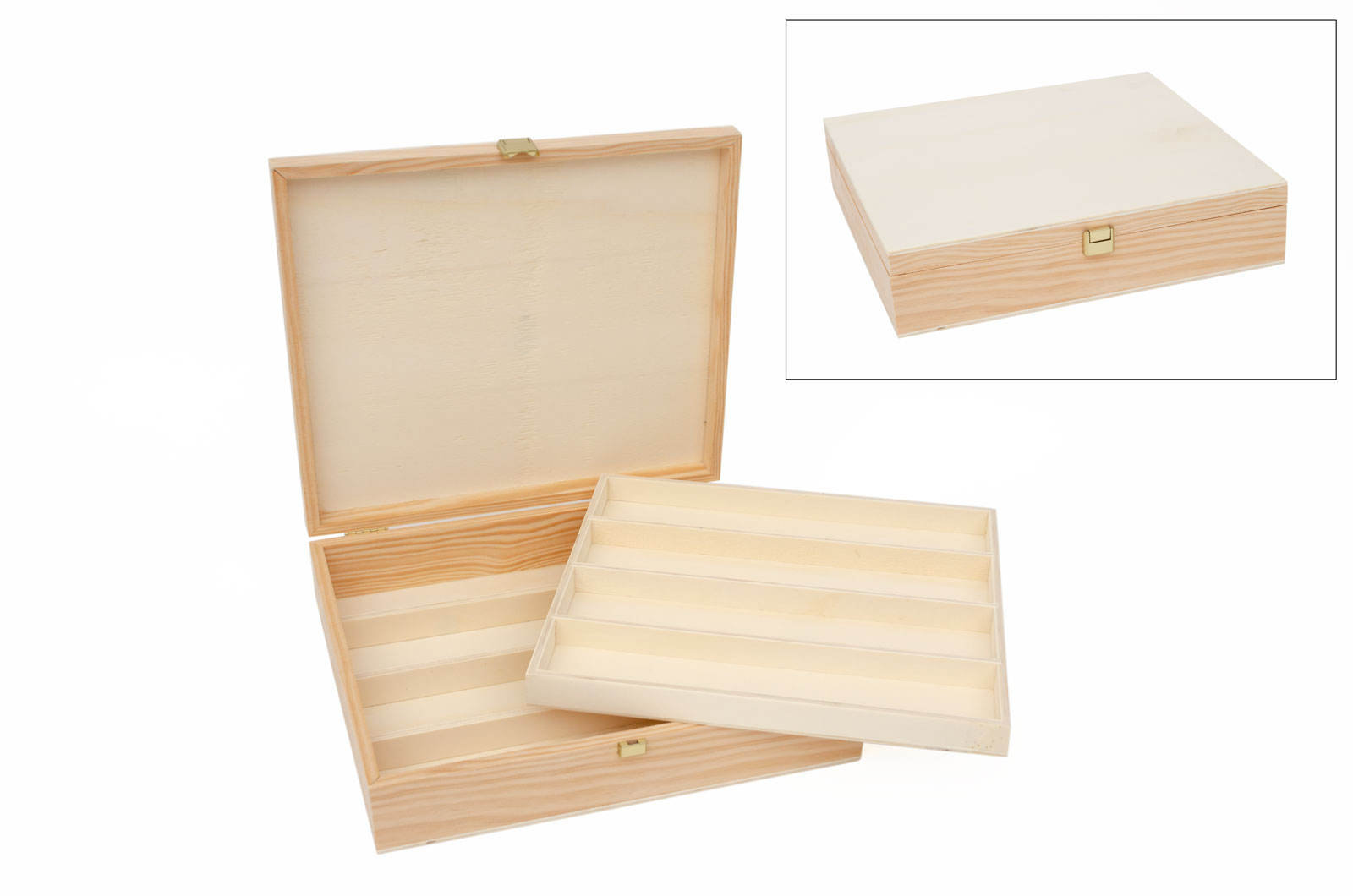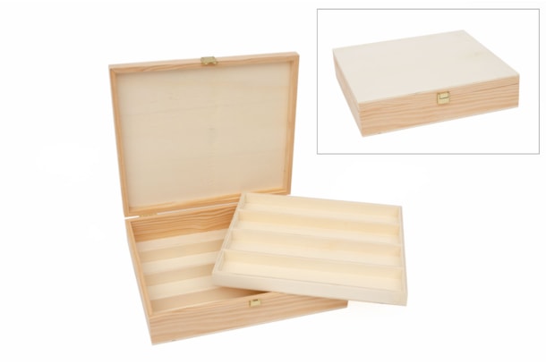 Caixa para guardar relógios em choupo de 8mm. Tem divisórias com 4 cm de largura e tem tabuleiro. Medidas:30x27x7cm.