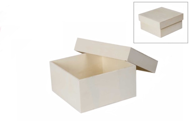 Caixa quadrada em choupo com tampa de encaixe. Esta peça não tem ferragens. Medida interior: 14.3x14.3x7.3cm