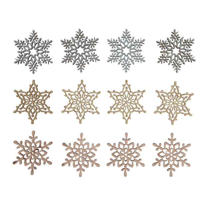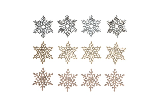 Conteúdo: 12 pedaços de floco de neve em madeira, 4 cm ø, cada um com 4 brilhos dourados, cinza claro, azul pombo/cinza, padrões diferentes, trabalhados em filigrana por corte a laser. Para colagem rápida com ponto de cola na parte de trás.