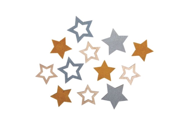 Conteúdo: 14 peças de dispersão de madeira “Estrela”, 4x esquerda natural, 3,5 cm, 4x ouro ocre flocado, 3,5 cm, 4x cinza-azul flocado, 4,5 cm Cada estrela tem um ponto adesivo no verso para colagem rápida