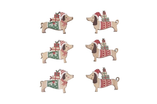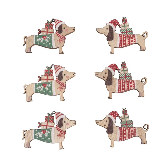 Conteúdo: 6 peças de caes de Natal em madeira, com aproximadamente 4,4 x 3,2 cm, sortidos.