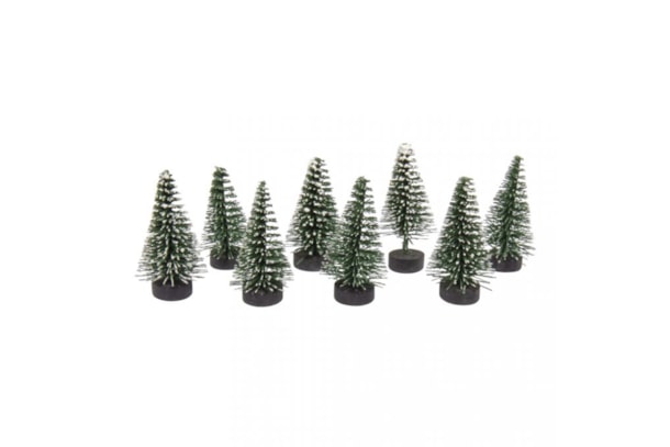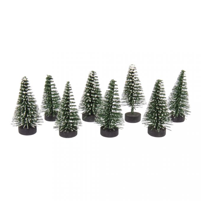 Os abetos decorativos verdes com neve têm 5 cm de tamanho e são embalados em uma caixa de PVC com 8 peças.