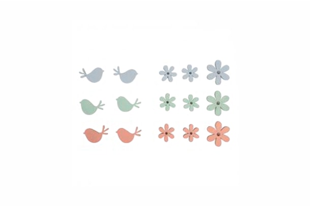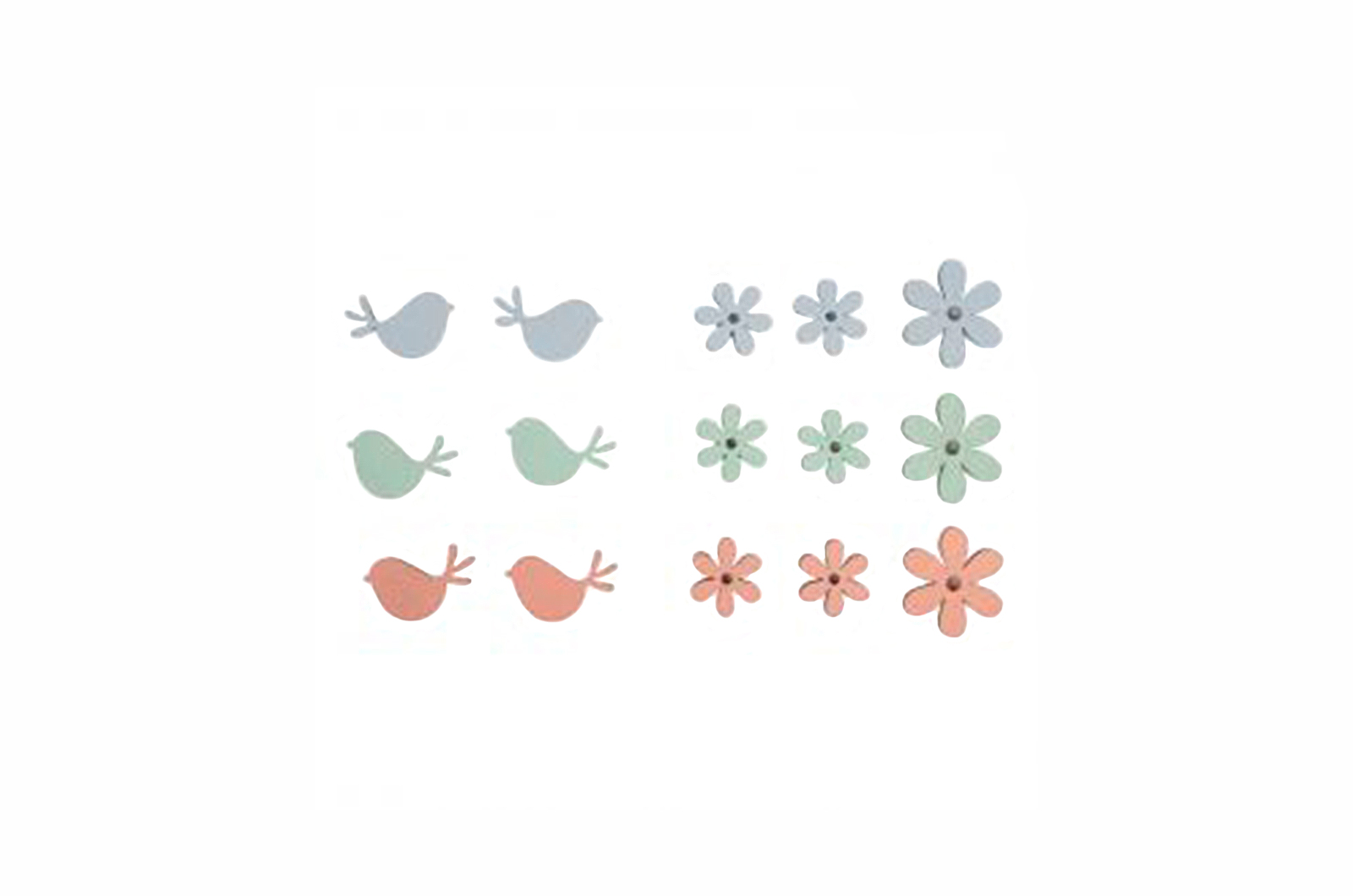 A embalagem contém 15 peças de madeira coloridas: 6 flores ø 2,5 cm, 3 flores 3,3 cm, 6 pássaros 3,3 x 2 cm. Com ponto adesivo na parte de trás para colagem rápida. Basta retirar o papel alumínio e colar.
