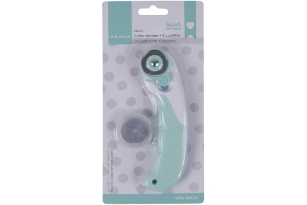 Cortador circular que inclui 3 laminas supplentes. Cortador com lamina giratoria de 28mm e botao de bloqueio . Cabo ergonomico que facilita para segurar na mão. Permite trabalhar com precisão em projetos de scrapbook e manualidades no geral, especialmente em tecido . Atençao : a lamina é muito afiada , contem peças pequenas. nao deve ser utilizada por crianças.