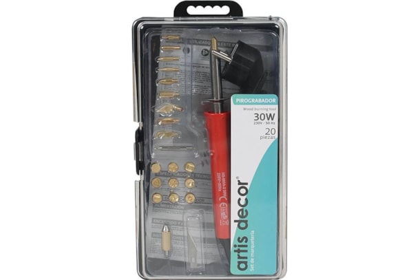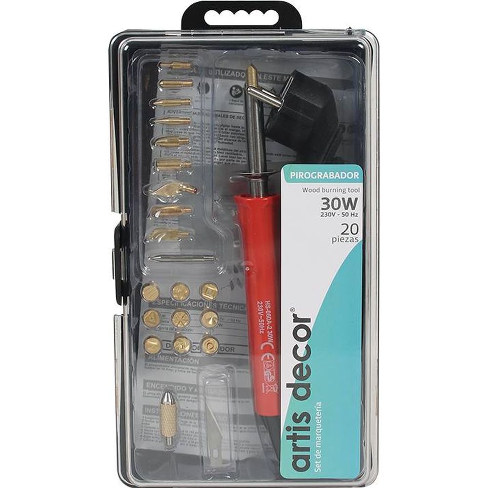 Pirogravador para gravar desenhos, texto e motivos de decoraçao em madeira, coro, contraplacado, etc. Este set contem 20 peças : ponta universal, pontas para criar inscriçoes, pontas para criar linhas finas, largas e fundas, pontas biseladas para criar linhas com sombras, pontas para cortar em espuma, plastico, nylon ou outros materiais sinteticos.