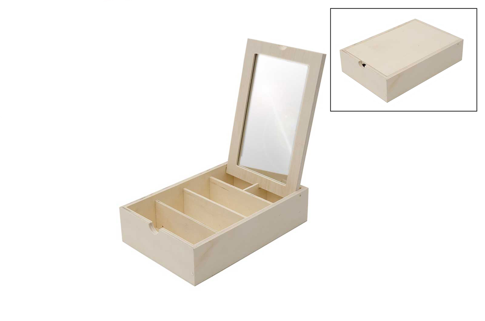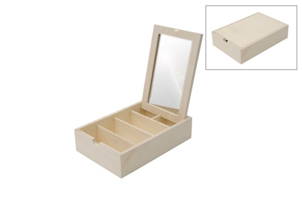 Guarda Jóias com tampa. Ao abrir a tampa tem um espelho na parte de trás. Por dentro tem divisórias que facilitam para organizar as suas jóias. Medidas:17x25x6cm.