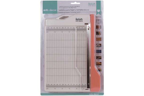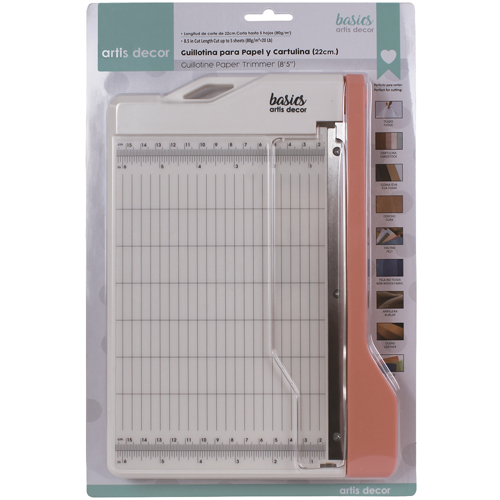 A pequena guilhotina Artis Decor possui um tamanho ideal para armazenamento e transporte, e corta inúmeros materiais como tecido, cartolina, goma eva, cortiça, feltro couro, ... Possui um comprimento de corte de 22 cm e na base permite medir até 15 cm e 6 polegadas. Inclui uma placa de segurança, que permite introduzir o material a ser cortado por baixo, deixando os dedos fora de perigo.