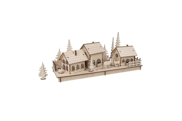 Conteúdo: Kit de construção 3D em madeira “Winter Village”, 84 peças, dimensões acabadas: comprimento 40 cm, largura 14,5 cm, altura 17 cm. Composta por 3 casas diferentes, árvores de Natal, veados, veados e coelhos. Vai precisar de: faca artesanal, cola, cores de sua preferência, enfeites, neve artificial etc. e se quiser iluminar as casas, As peças individuais de madeira são cuidadosamente cortadas nas placas para serem retiradas, montadas e coladas seguindo as instruções. As casas podem ser iluminadas através de uma pequena abertura. A caixa da bateria das luzes pode ser escondida na base de madeira. A madeira é certificada pelo FSC, um sistema de certificação internacional para uma silvicultura mais sustentável. Provém de florestas geridas de forma responsável.