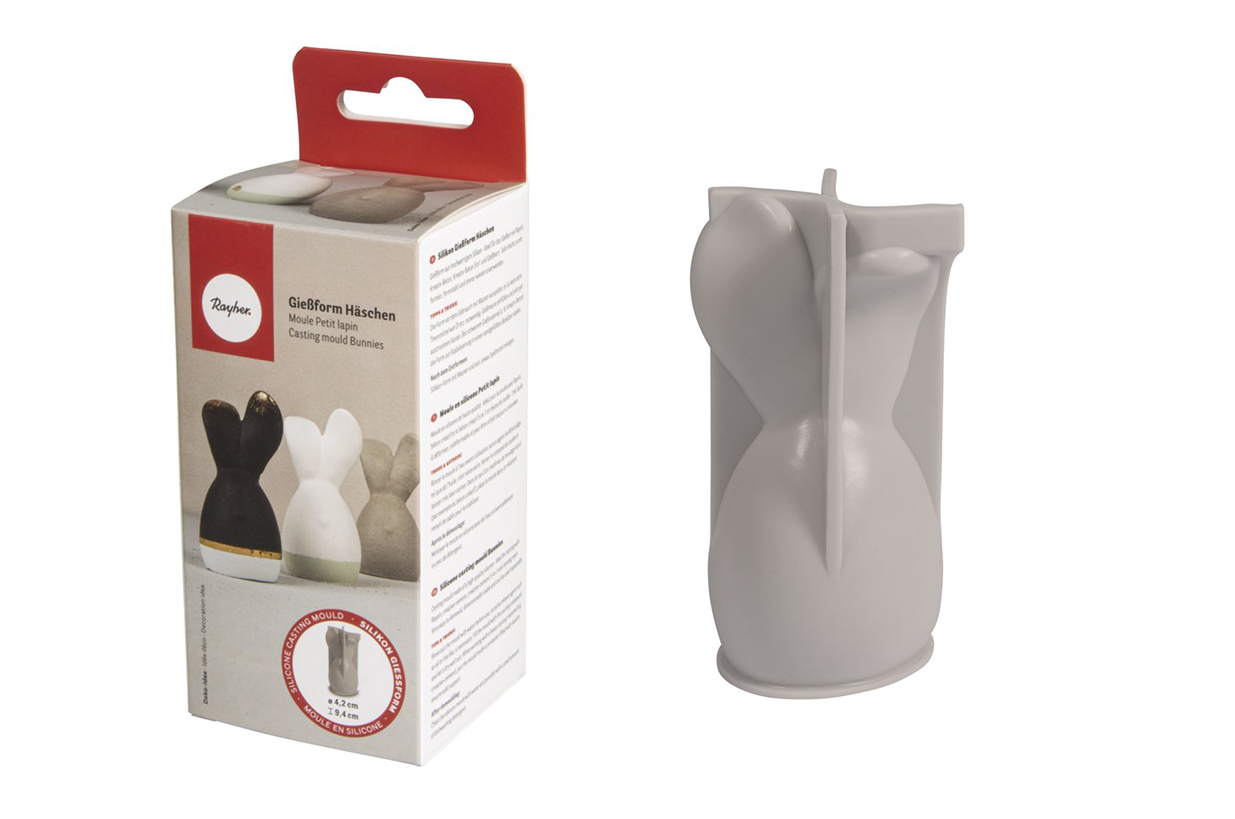 Se o molde for preenchido com Raysin, o Raysin deverá secar no molde por mais tempo do que o normal. Recomendamos um tempo de secagem de pelo menos 8 horas, mas é melhor deixar o coelhinho secar na forma durante a noite. Desta forma, o Raysin desenvolve dureza suficiente para a desmoldagem.