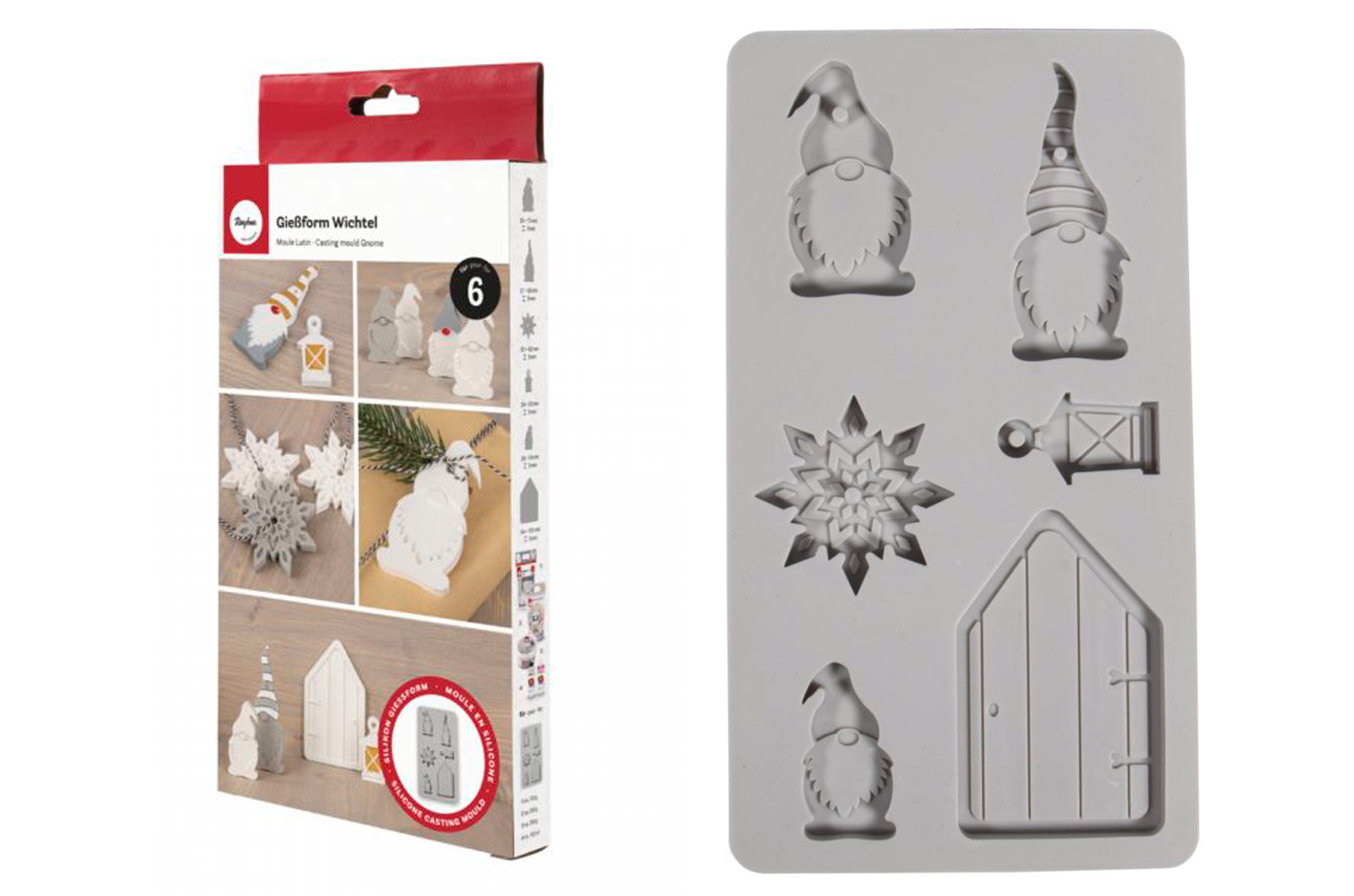 Molde silicone 26x14.5x1cm, 6 motivos diferentes. Medidas Gnomos 3.9x7.5cm- 3.7x9.5cm- 2.8x5.4cm - lanterna 2.9x5cm - floco neve 6.2x6.2cm - porta 6.4x10.1cm - altura 0.9cm