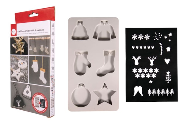 Forma de silicone 14 x 26 cm + molde de plástico DIN A5, 14,8 x 21 cm Dimensões dos 6 motivos: estrela 64x64 mm, meias 50x72 mm, luvas 35x67 mm, camisola 65x55 mm, gorro 42x55 mm, bola de Natal 54x65 mm (altura cada 10 mm) Ideal para vazar com pó de fundição Raysin 200 (aprox. 200 g), concreto criativo 5 em 1 (aprox. 220 g), concreto de joias (aprox. 200 g), resina de fundição ArtResin (aprox. 120 ml misturados), as quantidades sempre consulte todo o formulário. (Não é adequado para alimentos). Molde de fundição feito de silicone de alta qualidade, extremamente elástico, dimensionalmente estável e resistente ao gelo/calor (-40°C a +230°C). O material de silicone extensível torna particularmente fácil desmoldar os pingentes fundidos depois de secos. Em seguida, limpe o molde com água e possivelmente um pouco de detergente líquido, que pode ser usado várias vezes. Uma vantagem são os pequenos pinos para pendurar os orifícios integrados no topo dos motivos, que facilitam o enfiamento de anéis, fitas, etc. Você pode criar motivos natalinos nas formas secas com o estêncil autoadesivo e reutilizável feito de plástico fino. Simplesmente recorte os motivos, pressione sobre o motivo, pinte, limpe e guarde no filme de suporte. As cores e mídias ideais para pintura, rotulagem e decoração são as tintas acrílicas, por exemplo, tinta para uso geral, tinta Extreme Sheen, tinta chalky Finish, marcadores, metal decorativo e muito mais. Pressione sobre o motivo, pinte, limpe e depois guarde no filme de suporte. As cores e mídias ideais para pintura, rotulagem e decoração são as tintas acrílicas, por exemplo, tinta para uso geral, tinta Extreme Sheen, tinta chalky Finish, marcadores, metal decorativo e muito mais. Pressione sobre o motivo, pinte, limpe e depois guarde no filme de suporte. As cores e mídias ideais para pintura, rotulagem e decoração são as tintas acrílicas, por exemplo, tinta para uso geral, tinta Extreme Sheen, tinta chalky Finish, marcadores, metal decorativo e muito mais.
