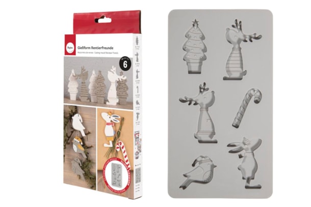 Molde de silicone com um total de 6 motivos individuais. Com o molde de silicone de alta qualidade, você pode criar pingentes de Natal mágicos, fundidos em concreto criativo, concreto decorativo, pó de fundição Raysin, resina de fundição ou cera. (Não é adequado para alimentos). Dimensões dos motivos (comprimento/altura/largura todos aprox. 8 mm): Árvore: L 3,5 cm, A 7,6 cm Alce: L 5,5 cm, A 8,4 cm Coelho: L 5 cm, A 7,5 cm Pássaro: L 5,5 cm, 4,8 cm Bastão de doces: L 2,2 cm, H 6,5 cm Requisitos de material, por exemplo, concreto para joias e concreto criativo 5 em 1 aprox. 150g ou Raysin 200 aprox. 120g molde de fundição silicone de alta qualidade, extremamente elástico, dimensionalmente estável e resistente ao gelo/calor (-40°C a +240°C). O material de silicone elástico torna os moldes fáceis de desmoldar após a secagem. Em seguida, limpe o molde com água e possivelmente um pouco de detergente líquido, ele permanece dimensionalmente estável e pode ser reutilizado. Dica para o aplicativo: Os moldes podem ser vazados em diferentes alturas, planos para figuras em filigrana e altos para displays decorativos. As cores e mídias ideais para pintura, rotulagem e decoração são as tintas acrílicas, por exemplo, tinta multiuso, tinta Extreme Sheen, tinta chalky giz, marcadores, metal decorativo e muito mais.