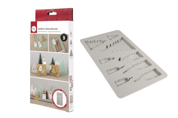 Molde de silicone para uma família de gnomos, 14,5 x 26 x 1,5 cm, 9 moldes individuais no total.