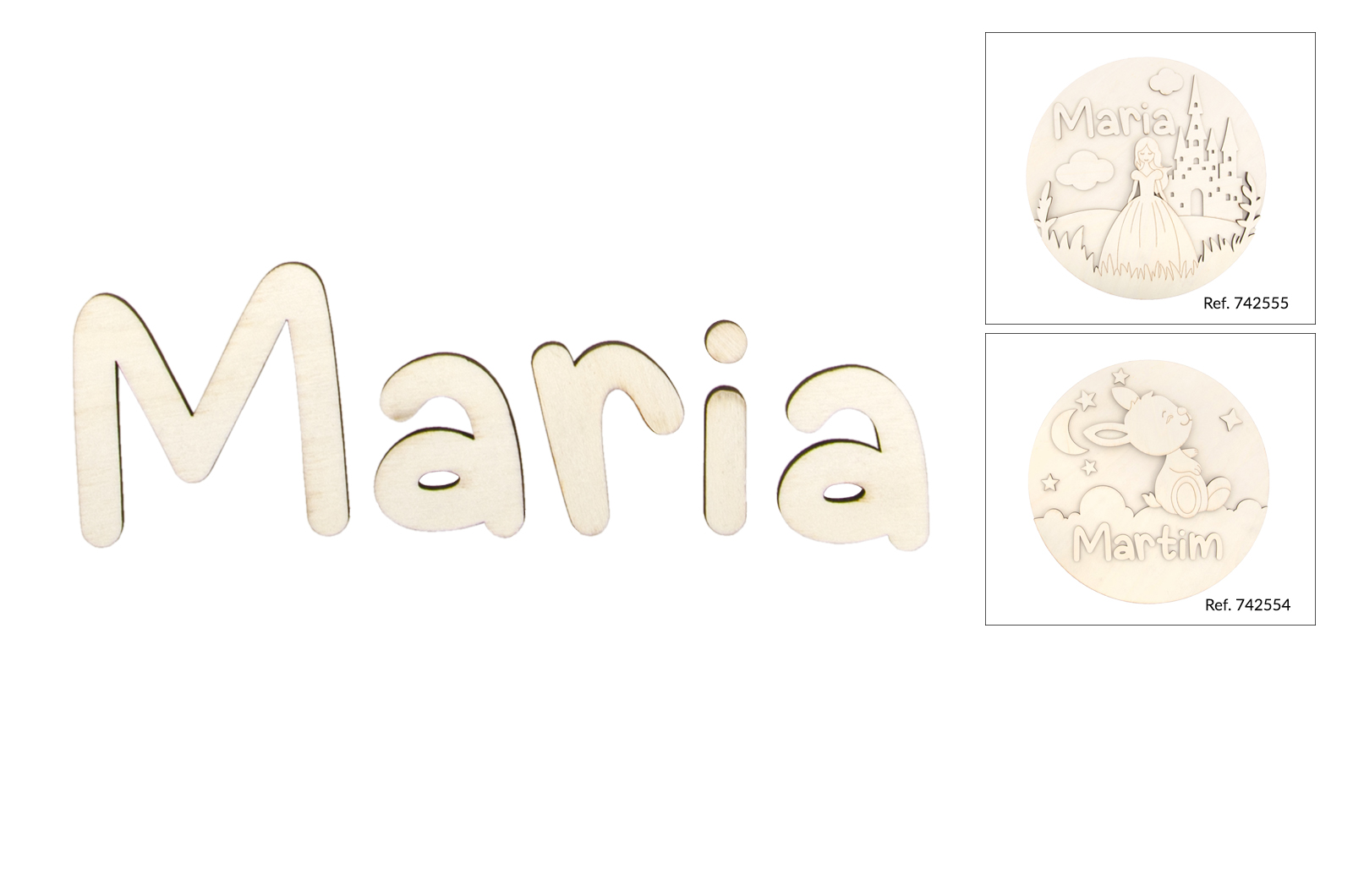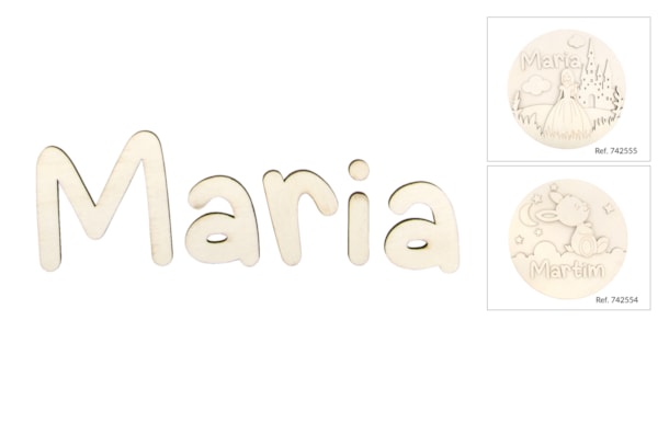 Nome personalizado em madeira de choupo natural, 4mm de espessura, perfeito para decorar e tornar especial as nossas bases infantis (Ref. 742554 e 742555). Tamanho variável, de acordo com o número de letras.